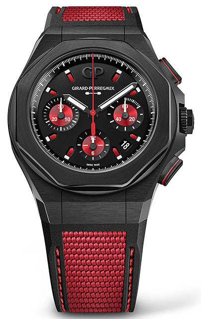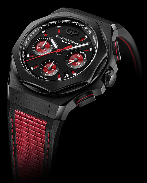 În ediție exclusivă, limitată de doar 50 de piese, Laureato Absolute Passion nu face compromisuri. Carcasa sa fațetată de 44 mm prezintă un tratament PVD negru cu atingeri de roșu care împodobesc întregul ceas, în semn de folosire a roșului în cronografele istorice ale lui Girard-Perregaux.
