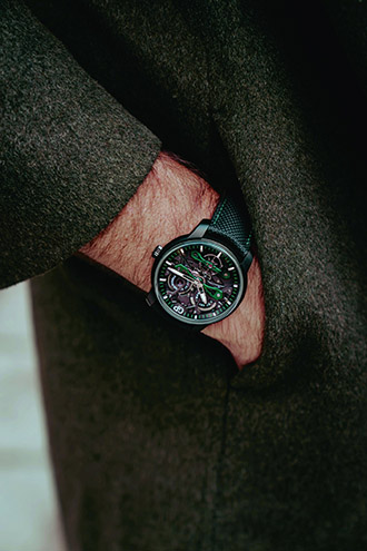 Fiecare contur și fiecare fațetă sunt rezultatul unei gândiri adânci, menite să ofere performanță și o experiență sublimă pentru purtător. Diferitele materiale au fost combinate pentru a înfierbânta sufletul și a seduce purtătorul cu impresia lor tactilă. De exemplu, cureaua este din cauciuc negru cu efect de țesătură și este însuflețită cu cusături verzi. Echipată cu o închizătoare triplă pliabilă din titan DLC, cureaua nu numai că îmbină încheietura mâinii minunat, dar arată și uimitor.