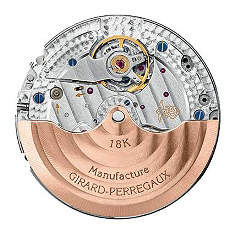 Văzut prin capacul din cristal safir al carcasei din aur roz de 40 mm, calibrul propriu GP03300-0130 are o frecvență foarte modernă de 4 Hz sau 28.800 vph și are 46 de ore de rezervă de mers. Finisajele Côtes de Geneve oferă o atractivitate sporită acestui ceas.