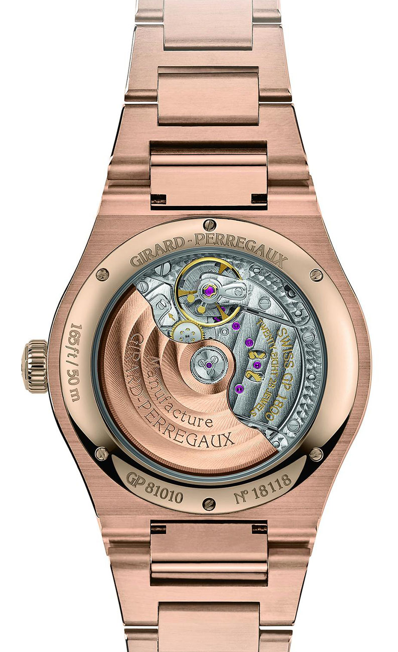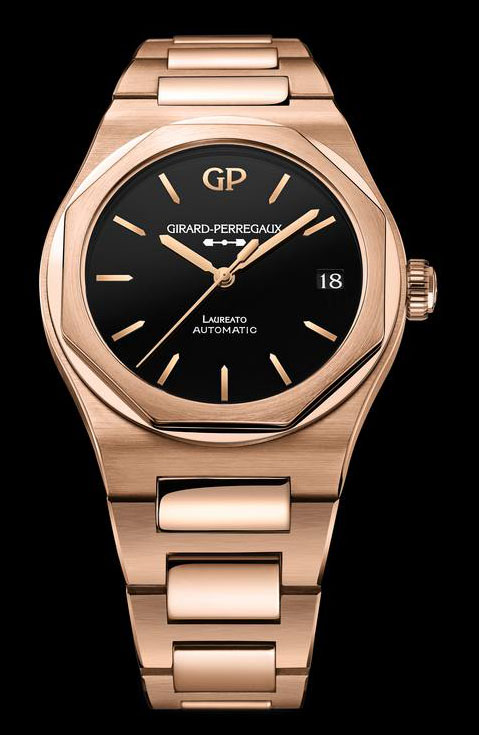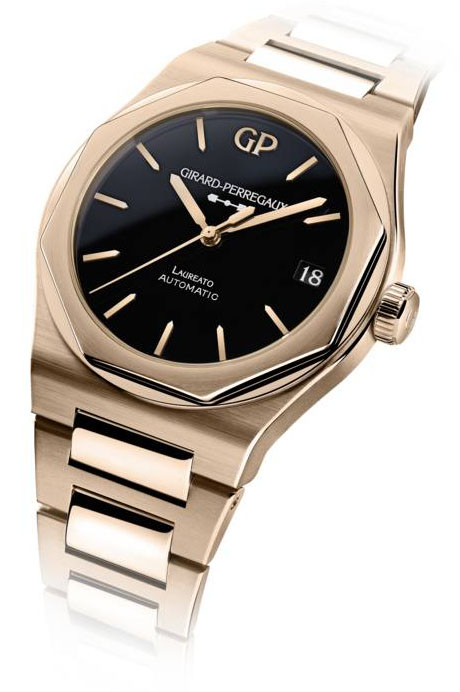 Arătătoarele, indecșii în stil baston și logo-ul GP, poziționat la ora 12, sunt prezentate în tonuri calde de aur. Mariajul dintre onixul negru intens și accentele de aur roz oferă un contrast proaspăt, o caracteristică legată de numele Laureato.
