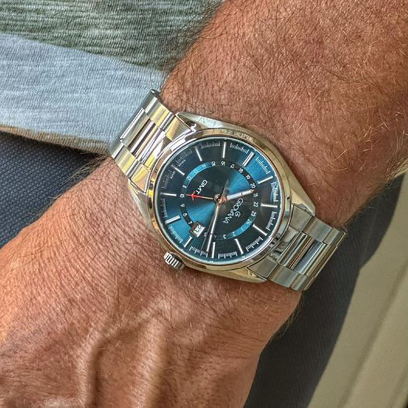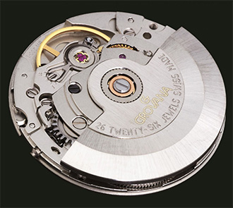 Grovana St. Andrews GMT este un model foarte popular printre călători datorită funcției GMT și ferestrei de dată din dreptul orei 3. Ceea ce atrage atenția este indicatorul GMT roșu în forma unui avion. Ceasul conține un mecanism cu cuarț Ronda 515/24H.