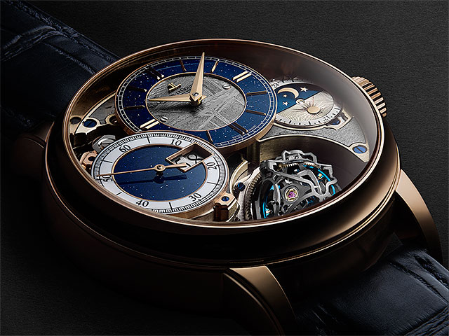 Pe lângă meteoritul încrustat în punțile de argint german, un disc de meteorit se află în centrul cadranului de afișare a timpului, înconjurat de un inel de aventurin cu indecși aplicați. Pe afișajul cronografului, un disc de aventurin este înconjurat de un inel de smalț alb grand feu, marcat cu indicațiile secundelor scurse. Ecranul zi / noapte cuprinde placa de 24 de ore pe care sunt aplicate două semicercuri de aur, câte unul pentru zi și noapte. Secțiunea albă de zi este decorată cu raze de soare, gravate manual, și cu un soare aplicat de aur roz lustruit; secțiunea de noapte dispune de lună și stele lustruite de aur roz, aplicate pe un fundal albastru bogat.