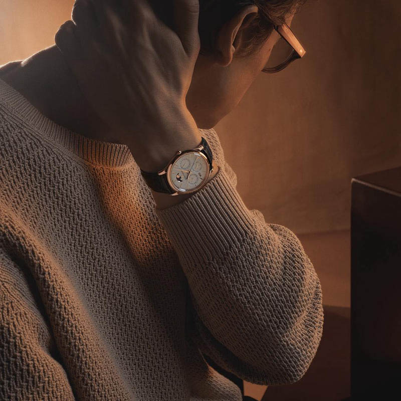 Îmbinând designul rafinat cu măiestria tehnică, modelul Master Ultra Thin Perpetual Calendar din aur roz prezintă un cadran în nuanța cojii de ou, cu subcadrane echilibrate pentru zi, dată și lună, precum și fazele Lunii la ora 12. Alimentat de calibrul 868 de ultimă generație, acesta ține cont automat de lungimea variabilă a lunilor și de anii bisecți, fără a necesita nicio corecție până în 2100 (un an secular care nu este bisect): o expresie modernă a eleganței perpetue.