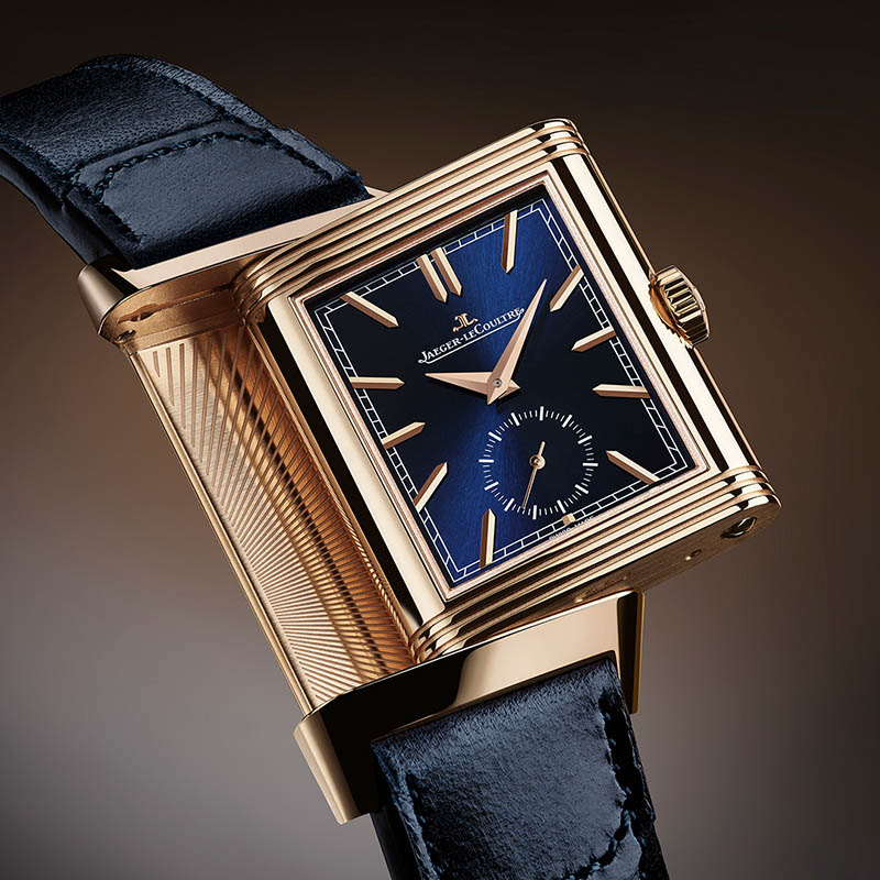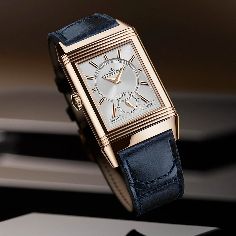 Ca omagiu adus înaintașilor, Reverso Tribute Duoface, în carcasa sa din aur roz, evocă modelele originale din 1931 prin elementele emblematice: scala minutelor tip „șină de cale ferată”, indecșii aplicați și arătătoarele de tip Dauphine. Pe cadranul principal, albastrul intens – obținut prin aplicarea a peste 20 de straturi succesive de lac – creează un contrast elegant cu calda nuanță a aurului roz. Verso-ul oferă un cadran argintiu cu finisaj raze de soare, animat de mecanismul manufacturat 854, capabil să afișeze un al doilea fus orar.