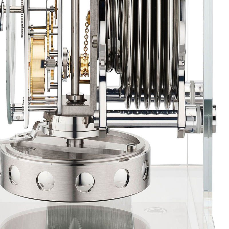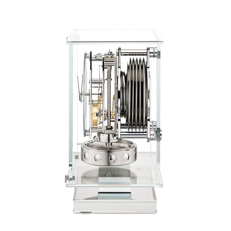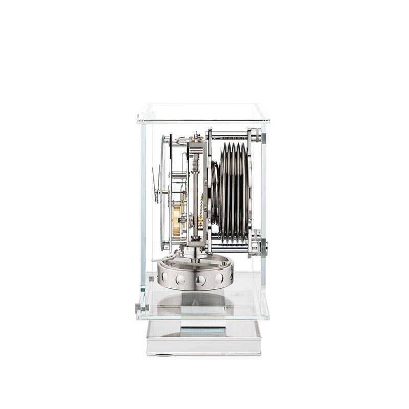 Cu o armonie estetică și cromatică remarcabilă, Atmos Transparente prezintă un nou cadran din sticlă care pune în valoare cei douăsprezece indecși orari fini, perfect drepți și de un negru intens. În centru, două arătătoare mari marchează orele și minutele, liniile lor stricte contrastând elegant cu rotunjimea cadranului. Geometriile opuse coexistă într-un echilibru perfect, reafirmând know-how-ul unic al lui Jaeger-LeCoultre.