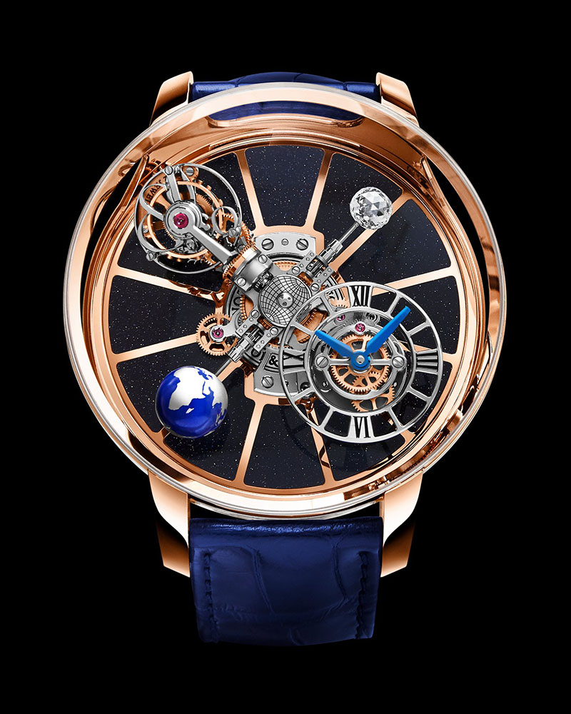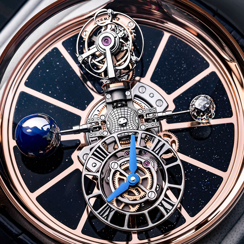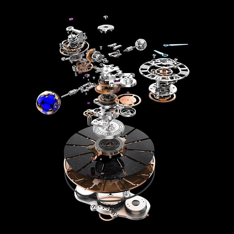 Toate acestea au loc deasupra unei plăci de bază, din aventurin, care strălucește ca un cer de noapte înstelată și pe care Luna de diamant și Pământul lăcuit albastru prind viață prin combinația de design și mișcarea componentelor ceasului.