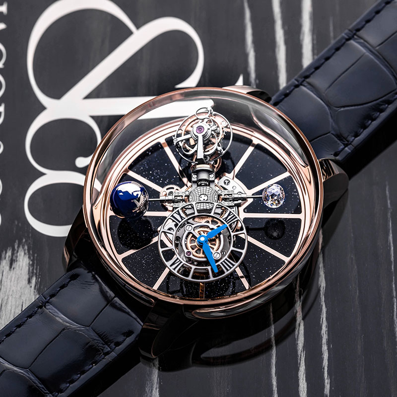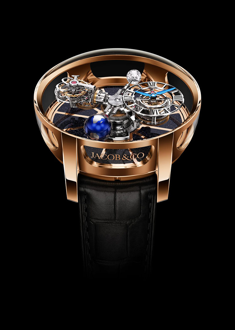 Astronomia Tourbillon este o cupolă magnifică din cristal de safir care încadrează un mecanism arhitectural, creând o senzație de expansiune cu axul său vertical și brațele orizontale. Și, așa cum ar fi de așteptat de la un ceas Jacob & Co., unele dintre aceste brațe au fost împodobite cu pietre prețioase foarte mari. Semănând cu un mic planetariu, pietrele prețioase strălucitoare atrag imediat privirea, atât de mult încât s-ar putea să nu fim atenți la mecanismele impresionante din jurul planetelor. La o a doua privire Astronomia ne dezvăluie mecanica inteligentă și designul jucăuș al mecanismului, în special în construcția turbionului și a afișajului timpului, care par să plutească în spațiu.