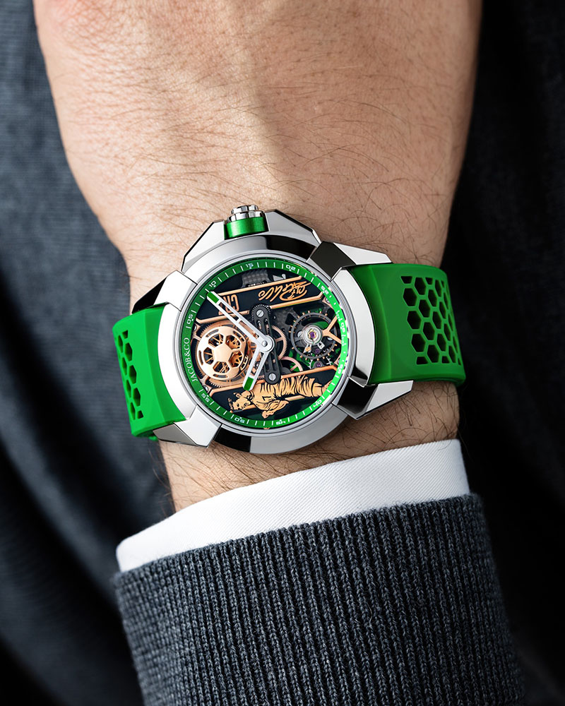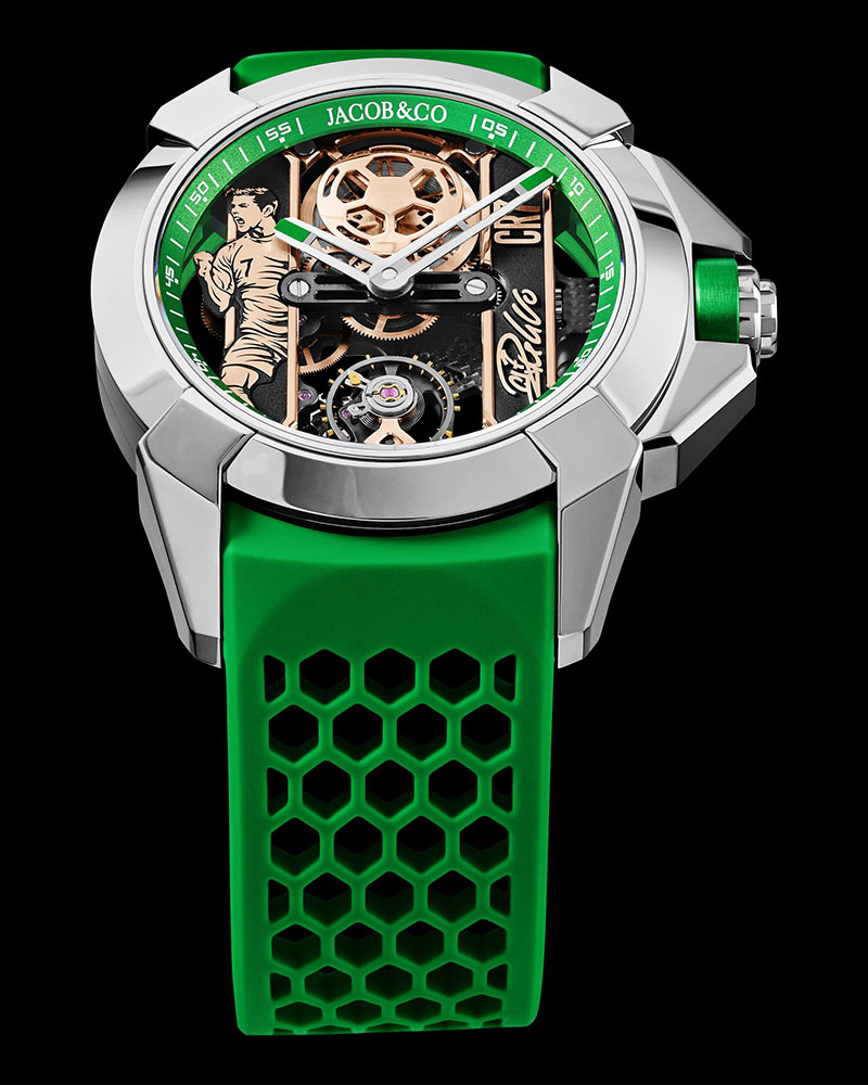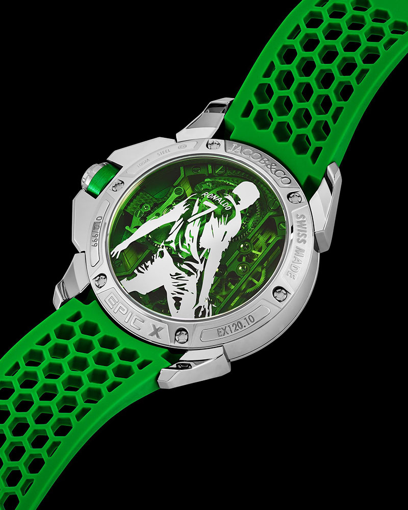 Colecția Jacob & Co x CR7 Epic X este o versiune profund personalizată a lui Epic X. Heart of CR7 are toate semnele sale de identitate: o carcasă de 44 mm cu anse în formă de X, coroana și flanșa interioara colorate în verde – culoarea preferată a lui Cristiano Ronaldo, asortate cu o curea sport perforata de cauciuc. Epic X Heart of CR7 este propulsat de unul dintre cele mai emblematice calibre ale Jacob & Co. Acest mecanism scheletonizat oferă o arhitectură izbitoare.