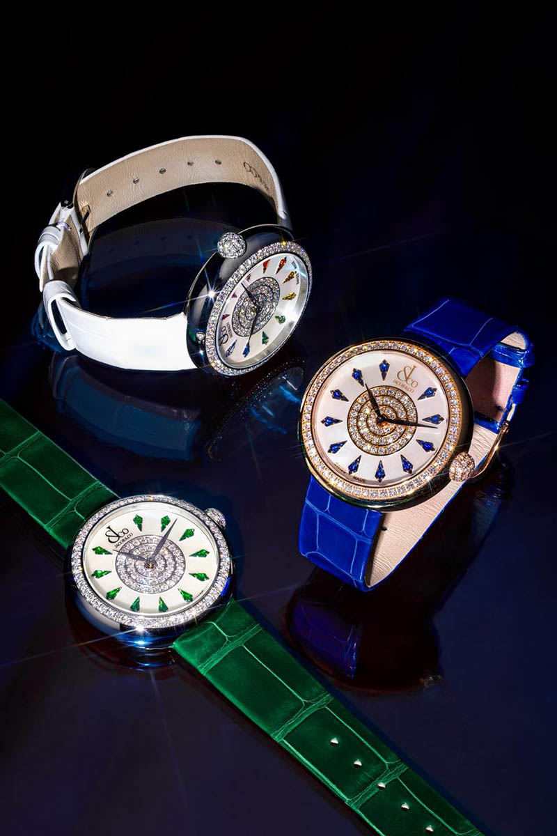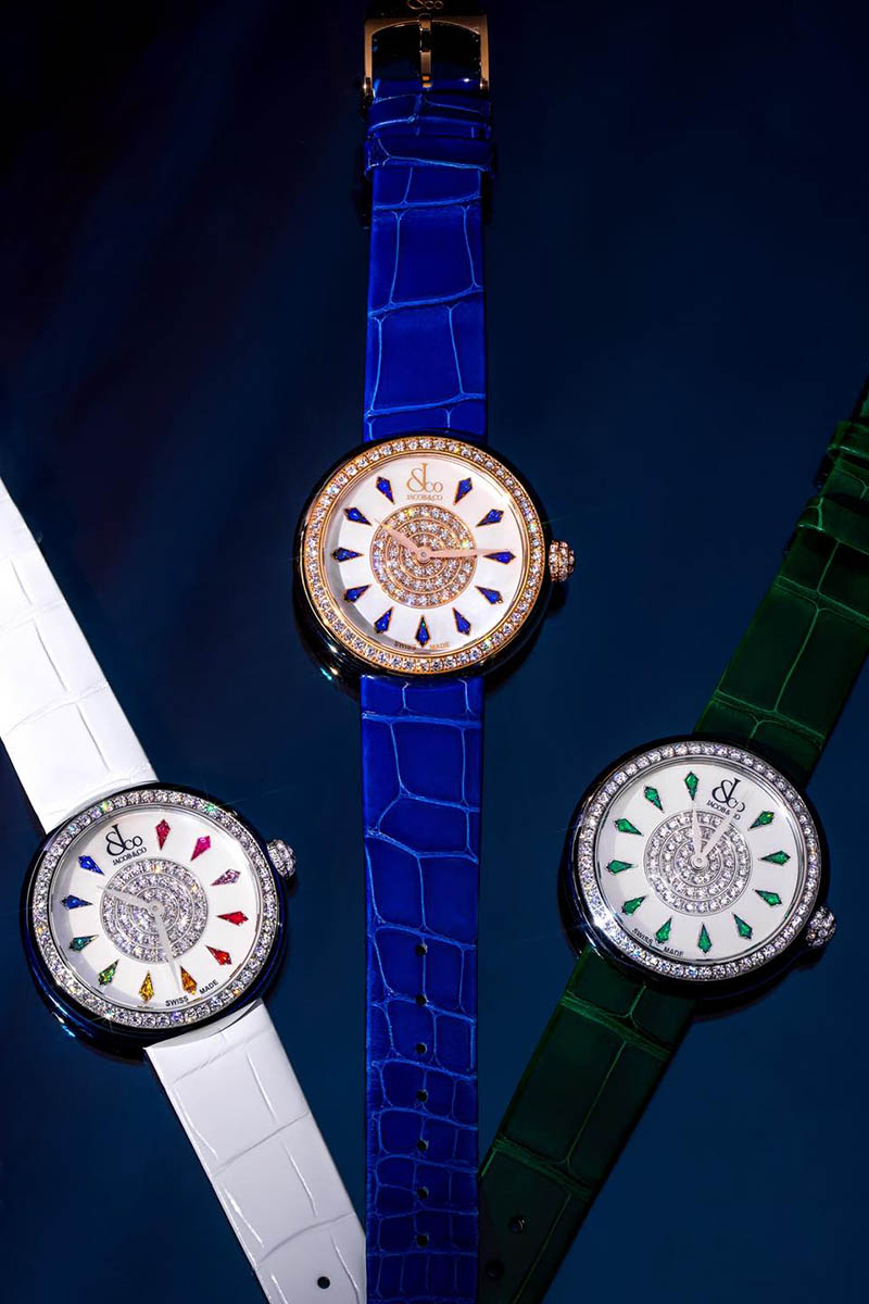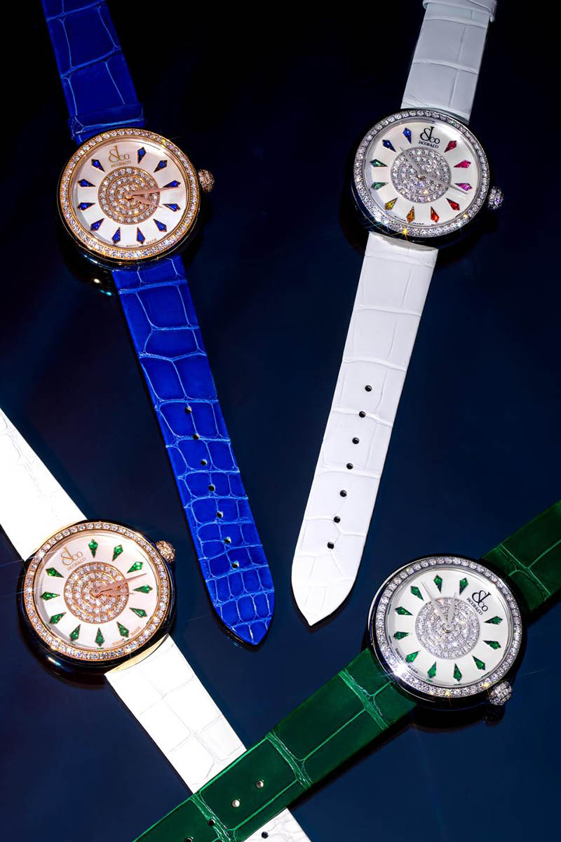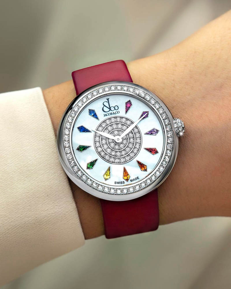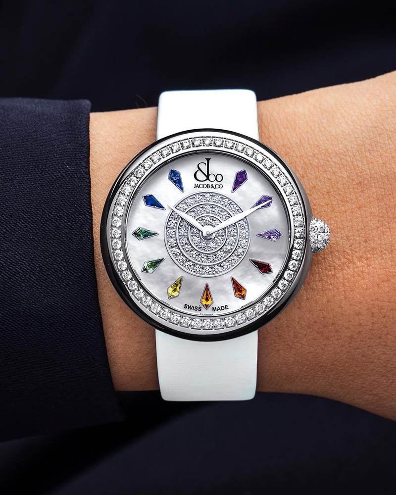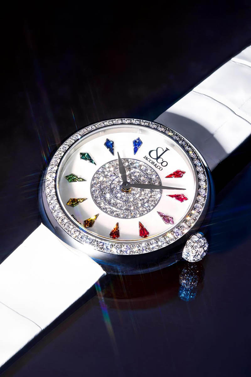 Cadranul din sidef este decorat cu un medalion central din diamante și o ramă de diamante dispusă în jurul acestuia. Tăietura „kite-cut”, extrem de rară și exclusivă Jacob & Co., conferă un caracter unic piesei, iar indicii orari sunt realizați din safire multicolore tăiate în aceeași formă de zmeu. În total, ceasul este împodobit cu 133 de diamante albe, aproximativ 2.35 carate, din care 31 de diamante (aprox. 0.39 carate) se află pe coroană, și 11 indecși din safire multicolore în total de aproximativ 0.44 carate.