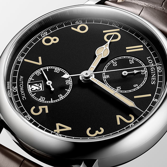 Fidel modelului original, noua variantă a lui Longines Avigation Watch Type A-7 1935 iese în evidență prin cadranul său negru, deplasat cu 40 de grade spre dreapta. Orientarea specială a cadranului le-a permis piloților să citească indicațiile fără a fi nevoiți să elibereze flanșa de control a avionului.