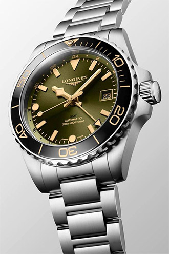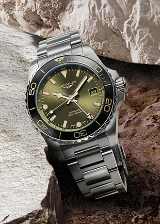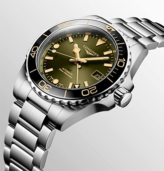HydroConquest GMT se distinge prin coroana înșurubată și prin noua lunetă cu crestături, unidirecțională, din ceramică, prevăzută cu o un marker luminos specific ceasurilor de scufundări. Suprafețele alternante lustruite și satinate ale carcasei și brățării, adaugă un plus de rafinament și eleganță acestui nou model. Cadranul verde are o flanșă împărțită în 24 de sectoare orare iar arătătoarele aurite sunt acoperite cu Super-LumiNova, fiind ușor de citit în orice circumstanțe. Priviți atent cadranul și veți observa ca indecșii orari sunt diferiți între ei, o caracteristică aparte a acestui model de ceas. Aceștia sunt rotunzi la ora 6 și 9 iar la ora 12 indexul este triunghiular, trăsătură caracteristică unui ceas de diving. Indicatorul GMT în formă de săgeată ne indica ora fusului orar setat.
