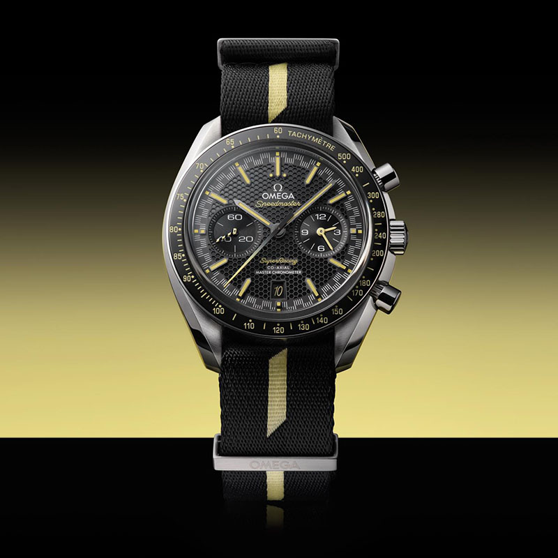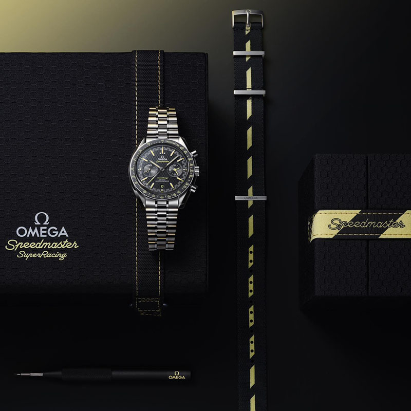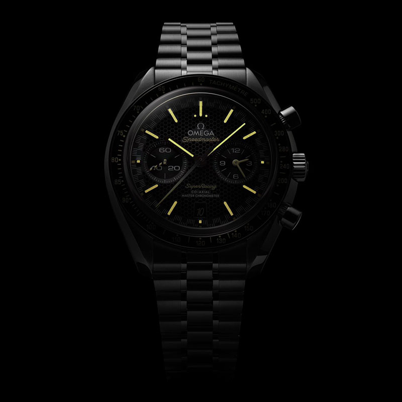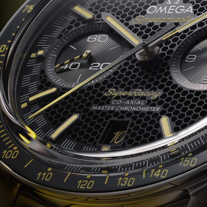 Vârfurile indecșilor negri sub formă de săgeată, teșite și lustruite cu diamant, sunt umplute cu un nou și exclusiv amestec Super-LumiNova care emite o strălucire galbenă surprinzătoare. Acest cod de culoare se extinde la cuvintele "Speedmaster" și "Super Racing" de pe cadran. La ora 6 există un memento periodic și elegant al aniversării a 10 ani de mecanisme cu rezistență magnetică "peste 15.000 GAUSS": în fereastra de dată, ziua de 10 a lunii apare scrisă în fontul logo-ului Speedmaster.