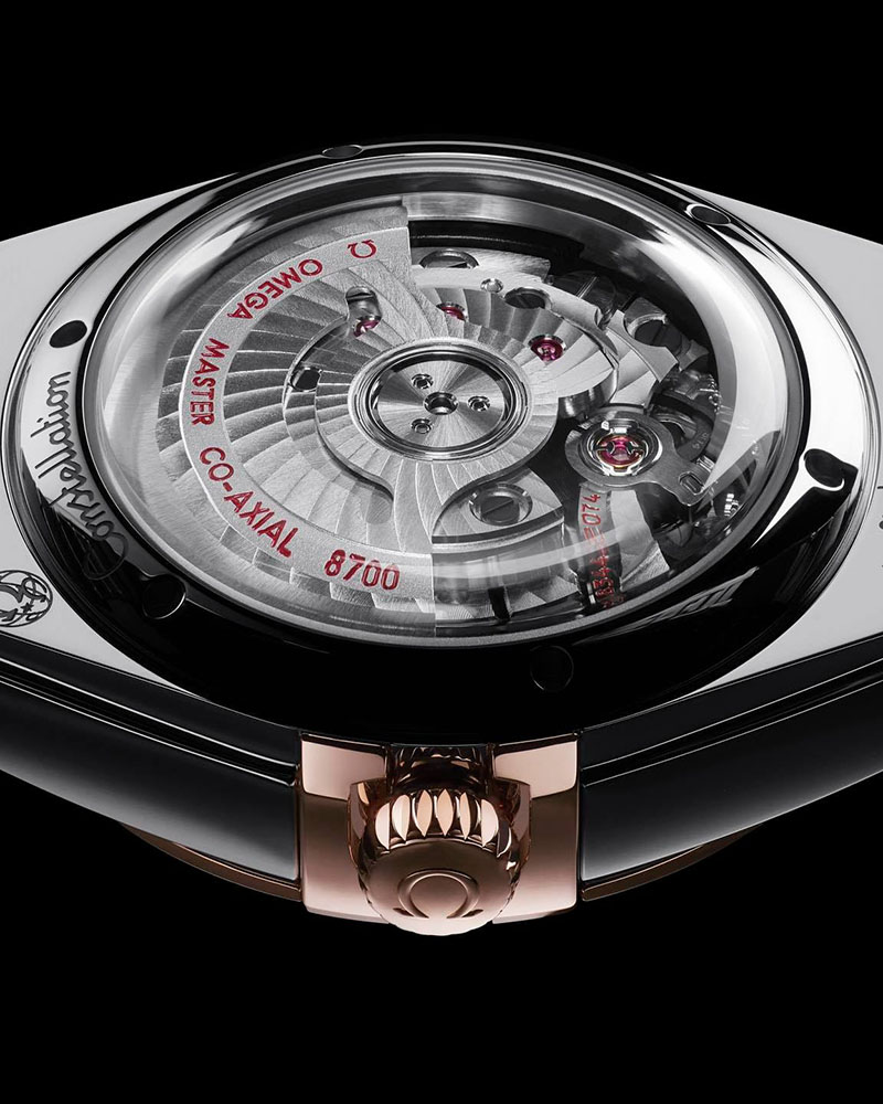 Ceasul are o brățară bicoloră, cu o reglare ușoară pe încheietură, și este alimentat de calibrul OMEGA Co-Axial Master Chronometer 8700, care este vizibil prin spatele carcasei din cristal de safir.