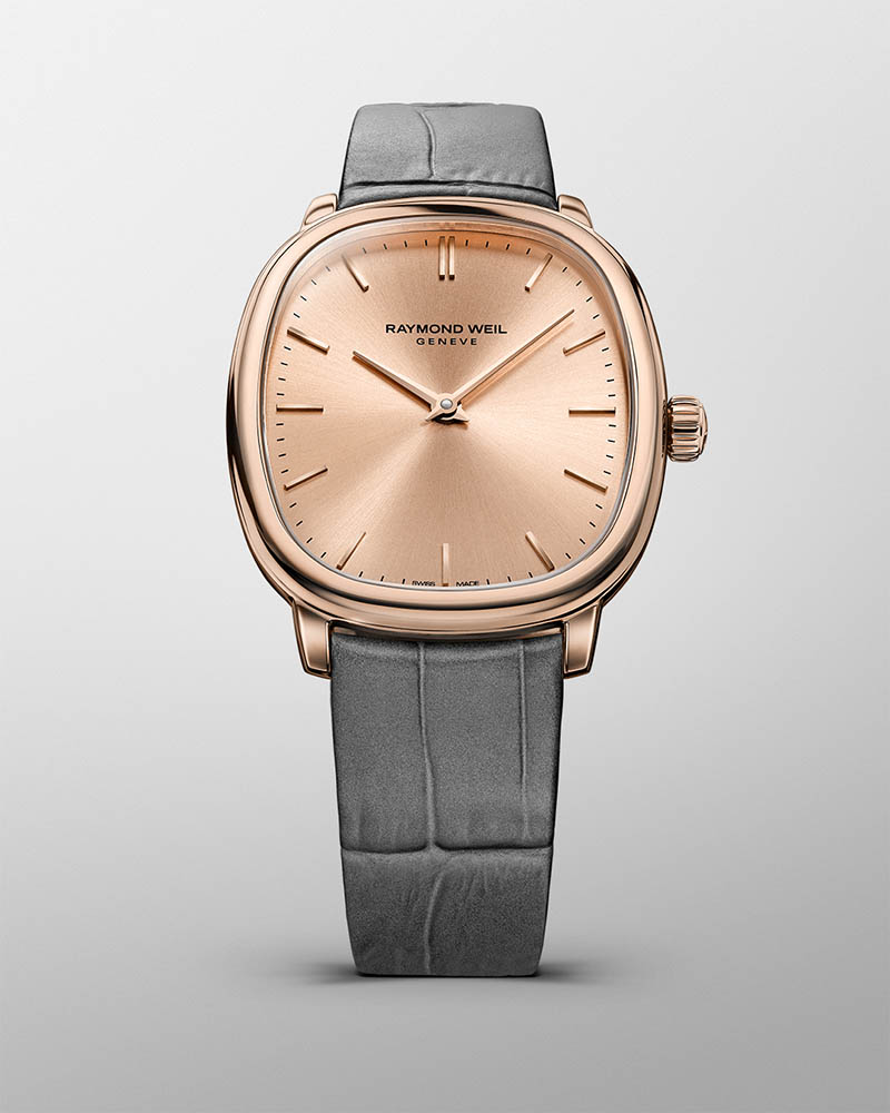 Această evoluție este completată de o coroană nou concepută, subtil modernizată și decorată cu o monogramă rafinată, pentru o vizibilitate sporită, aducând un omagiu moștenirii orologere a brandului. Luneta rotunjită și carcasa amplifică silueta și caracterul rafinat al ceasului. Continuând această expresie a măiestriei, ceasurile sunt echipate cu curele din piele naturală de vițel cu margini rulate, un detaliu preluat direct din codurile de design istorice Raymond Weil.