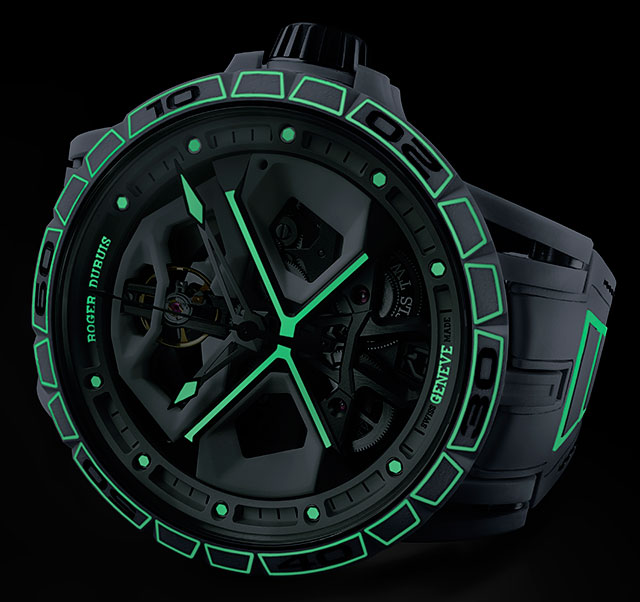 Îmbunătățit cu o altă performanță tehnică, Excalibur Spider Huracán strălucește noaptea, în timp ce obsesia Casei pentru lumină și luminescență strălucește atât prin flanșa superioară, cât și prin arătătoarele umplute cu Super-Luminova. Într-un exemplu strălucitor care arată că Roger Dubuis merge acolo unde ceilalți nu îndrăznesc, Super-Luminova este aplicat și pe suprafețele înclinate ale ceasului, depusă pe barele suportului datorită unui proces inovator utilizat pentru prima dată la o premieră mondială Roger Dubuis anul trecut.