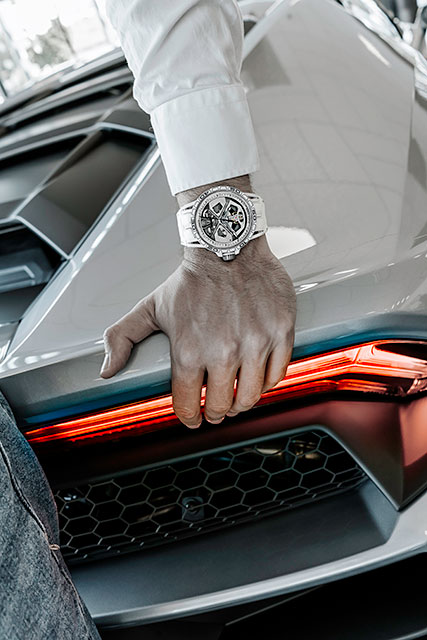 Privită din spate, mecanismul semi-scheletizat dezvăluie greutatea jantei oscilante cu 360°, care reproduce efectul de viteză asemănător al unei jante Huracán, emulând în același timp și designul jantei. O coroană inspirată de piulițele de curse ale supermașinii este asociată cu o punte de design cu o bară de sprijin, care amintește de cele găsite pe motorul Lamborghini Huracán V10 însuși. O caracteristică de dată criptică îi îmbunătățește alura jucăușă, în timp ce un sistem de eliberare rapidă de pe cataramă și curea asigură că ceasul este ușor interschimbabil. Limitat la doar 88 de piese, acesta nu este un ceas obișnuit. Acesta este un ceas pentru cei care îndrăznesc să caute următoarea lor oră de vârf.