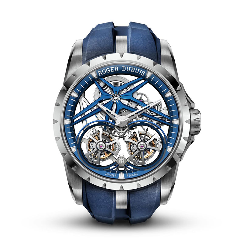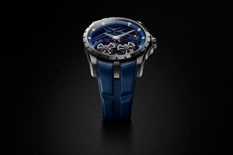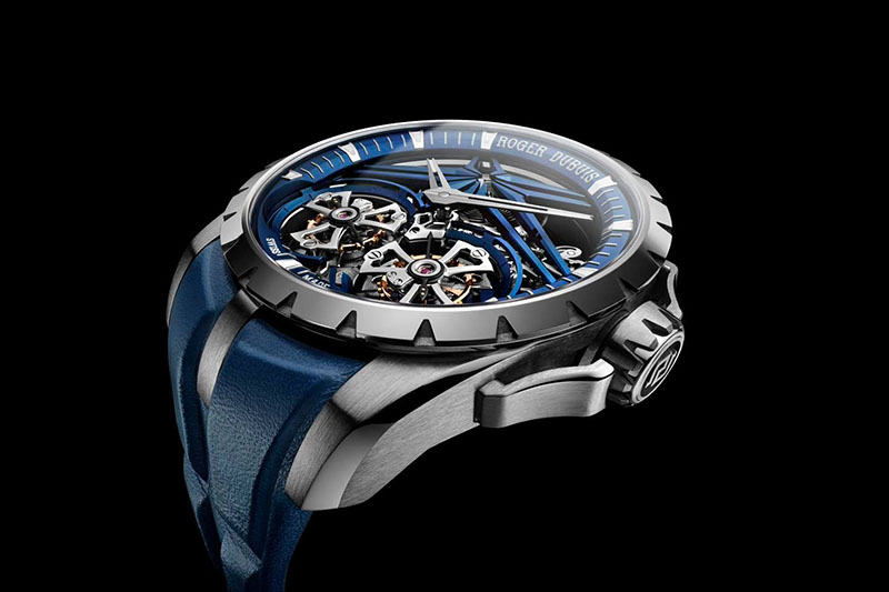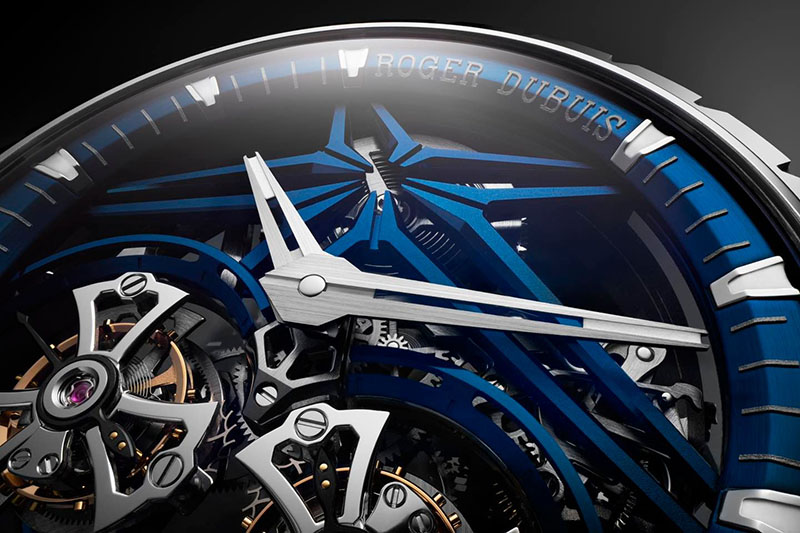Ca un omagiu adus acestei nuanțe organice, Roger Dubuis a învăluit arhitectura scheletizată a acestui ceas într-o culoare albastră distinctivă, inclusiv semnătura astrală care este inerentă identității manufacturii. Este un aspect îndrăzneț și puternic, care se oglindește ulterior în cureaua din piele de vițel albastră a ceasului, cu sistemul versatil de eliberare rapidă.