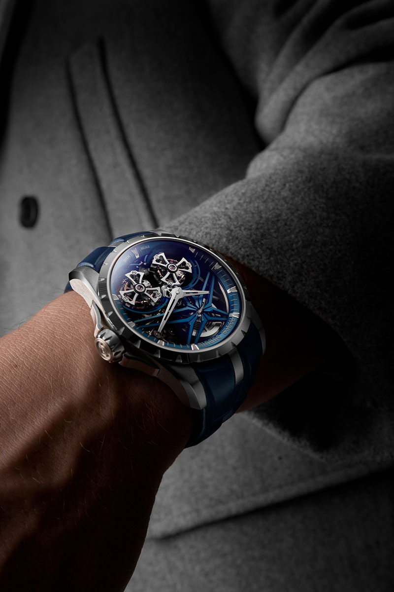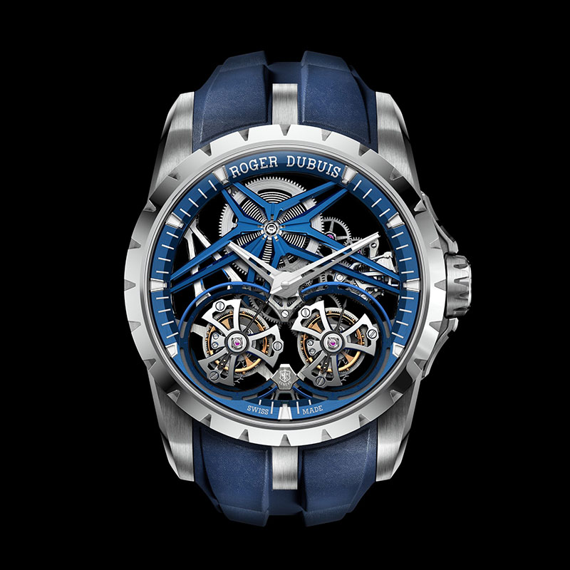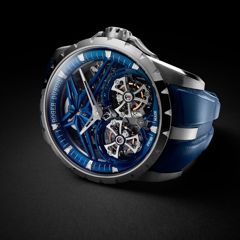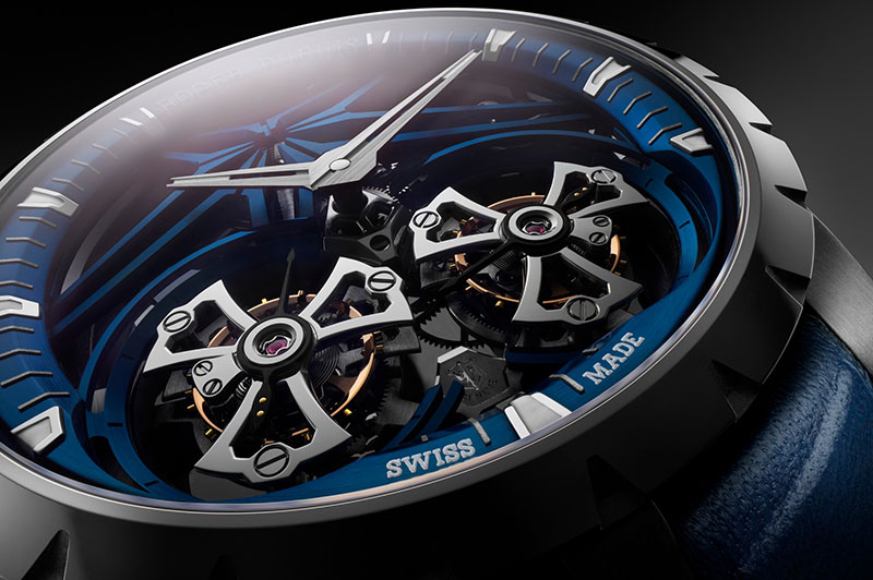 Pentru noul model Excalibur Double Tourbillon Cobalt, întreaga carcasă de 45 mm este realizată în Cobalt Chrome, ceea ce evidențiază și impune măiestria artizanilor Roger Dubuis.