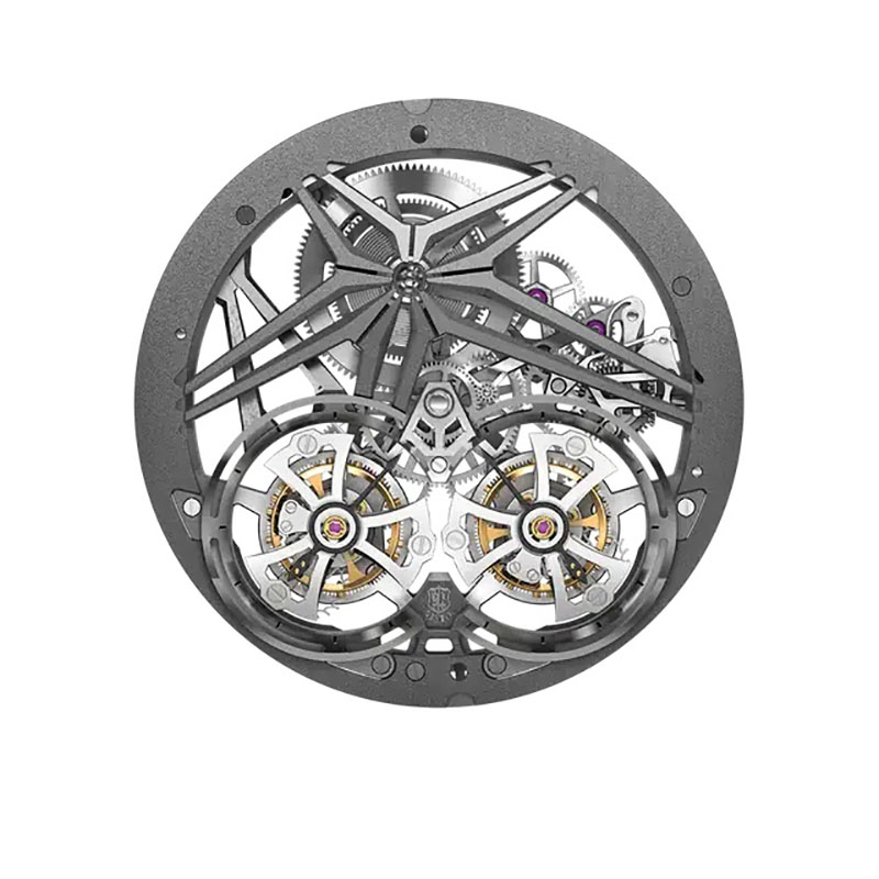 Una dintre complicațiile de vârf în lumea orologeră este turbionul. Realizarea unui turbion, micuța mașinărie din interiorul unui mecanism care poartă balansierul în afara efectelor gravitației, este extrem de dificilă. De regulă sunt necesare aproximativ o sută de piese care trebuie să funcționeze împreună în angrenajul său și apoi cu restul mecanismului ceasului, pentru că reducerea efectului gravitației să fie pe deplin împlinită. Punerea împreună a două turbioane într-un singur ceas este o și mai mare provocare! Iar a pune un dublu turbion zburător într-un mecanism scheletonizat tridimensional este pur și simplu genial, îndrăzneț și extravagant.