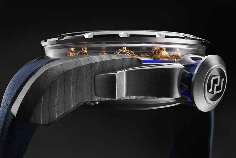 Montată pe carcasa Titanium Damascus, designerii au adăugat o lunetă din titan lustruit, care oferă un contrast izbitor între finisajul mat și modelul unic al corpului principal al ceasului.