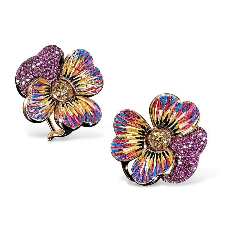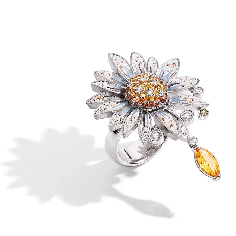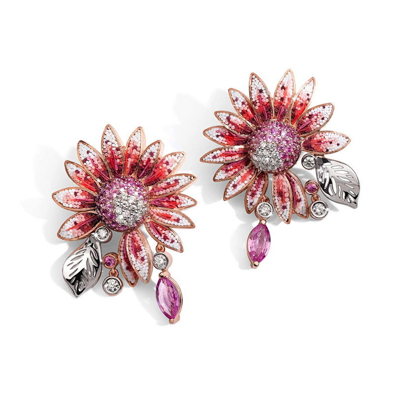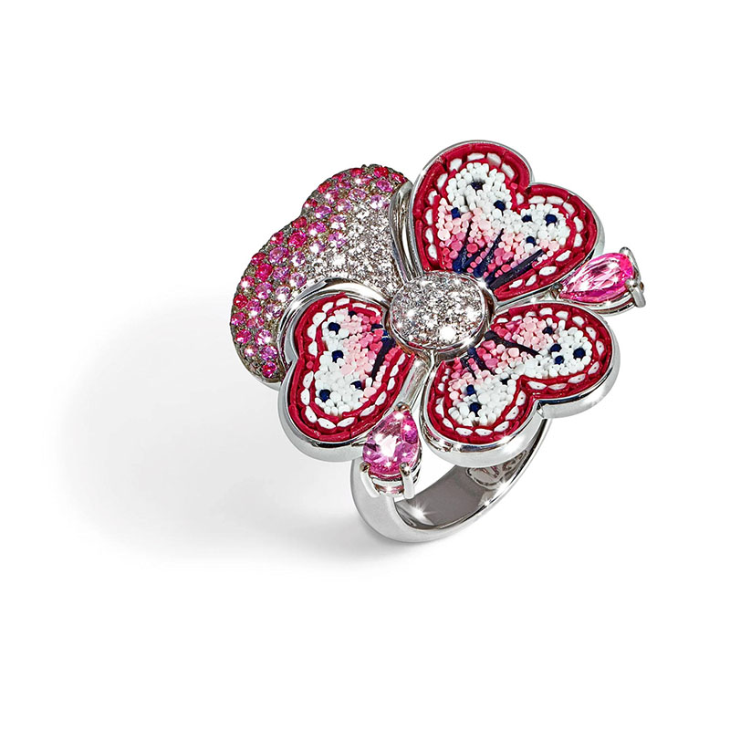 Realizat manual cu o măiestrie meticuloasă, îmbină alura atemporală a micromozaicului, îmbrățișarea delicată a aurului roz și strălucirea irizată a safirelor roz.