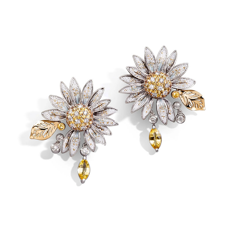 Pregătește-te să fii încântat de frumusețea colierului Daisy. Impregnat de eleganță grațioasă, realizat manual din aur alb, diamante strălucitoare și safire galbene.
