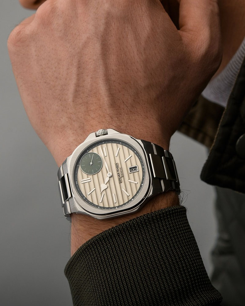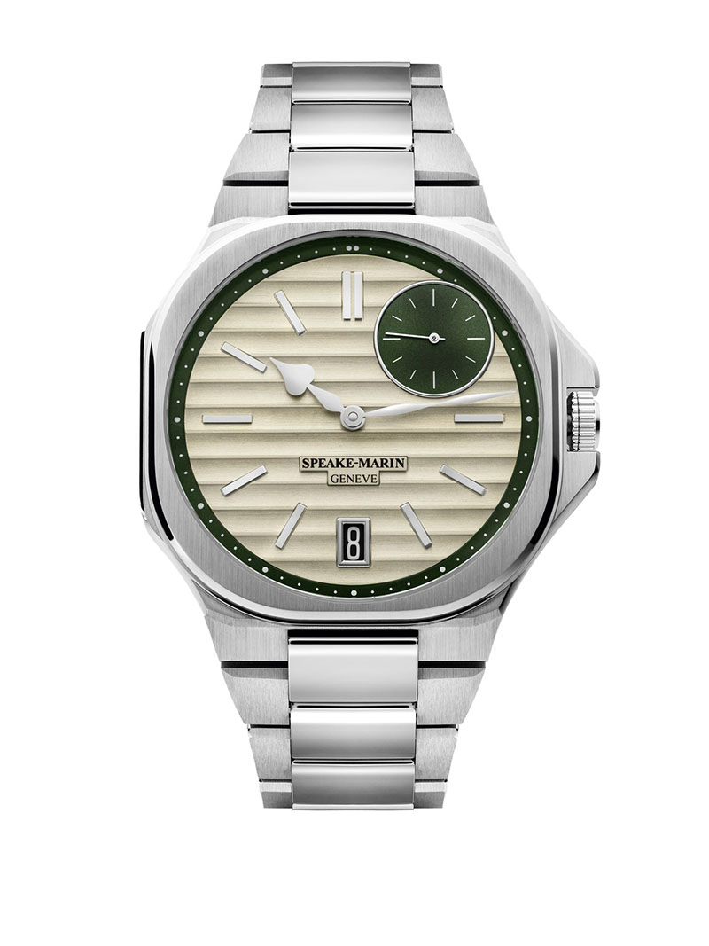 În acest fel, undele sunt îmbunătățite de o interacțiune spectaculoasă de lumini care adaugă adâncime cadranului. La 1.30, într-o poziție atipică în comparație cu modelele tradiționale, se află secundarul periferic, a cărui poziționare pe cadran a devenit o caracteristică distinctivă a lui Speake Marin. Este împodobit cu un finisaj în raze de soare în nuanță verde cu reflexii gri care contrastează puternic cu nuanța dominantă. Aceeași nuanță revine pe pista minusculă a minutelor marcată de puncte albe care se potrivește armonios cu fundalul negru al ferestrei dreptunghiulare de dată de la ora 6.