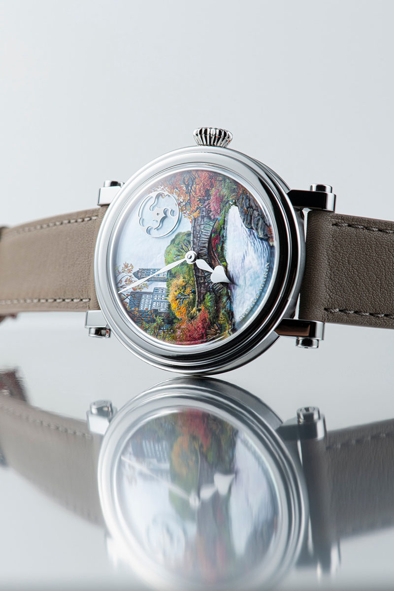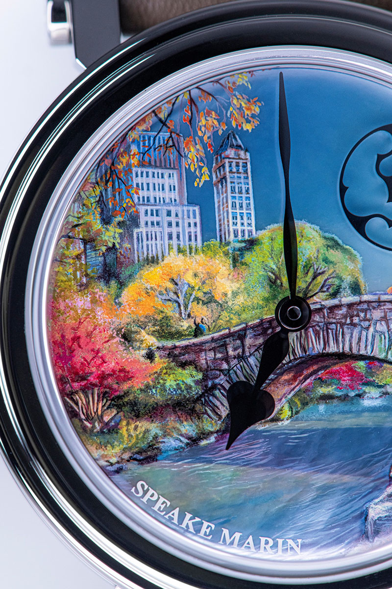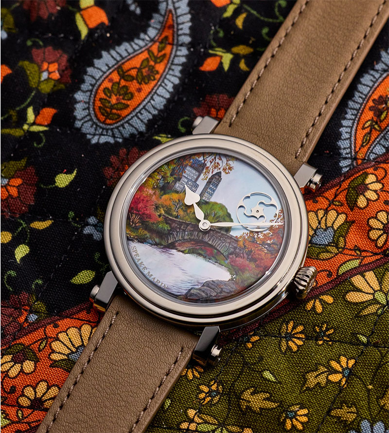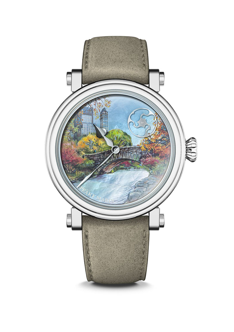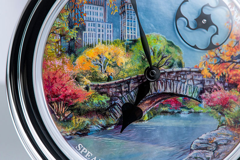 Cadranul prețios din mother-of-pearl al acestei creații a devenit o pânză pe care au prins viață amintirile plimbărilor ei de duminică în Central Park. Designul a fost centrat pe pitorescul pod Gapstow, reprodus într-o micro-pictură remarcabilă, realizată cu măiestrie de un artist care a surprins numeroasele detalii.