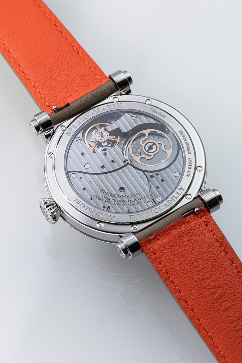 Carcasa, armonios creată, cu linii fluide și elegante, este realizată din titan de gradul 5, finisat lustruit/satinat – un material apreciat pentru ușurința și rezistența sa la coroziune. Aceasta oferă confort pe încheietură, având un diametru de 42 mm, o carcasă centrală satinată, o coroană zimțată pentru o prindere facilă, împodobită cu sigla manufacturii, precum și anse geometrice cu șuruburi care fixează cureaua din piele taupe, dublată cu piele portocalie și echipată cu o închizătoare din titan.