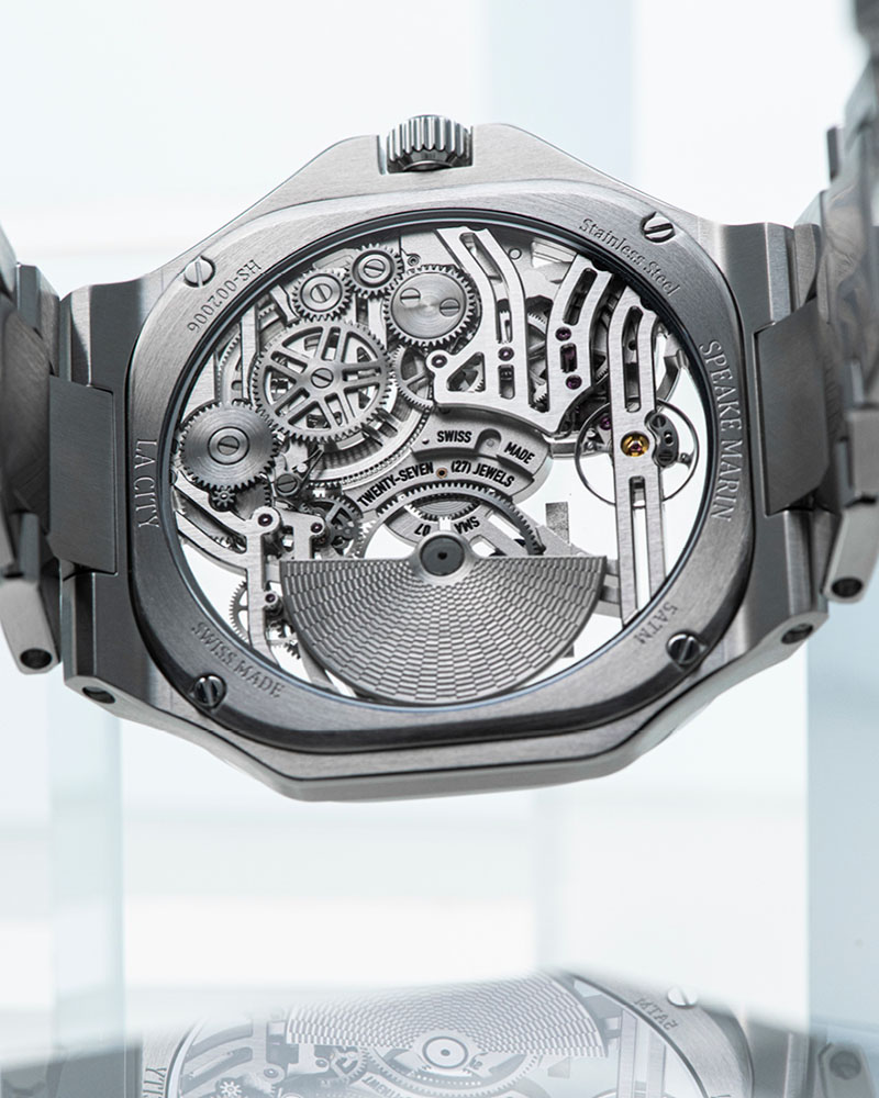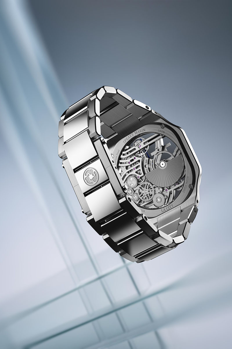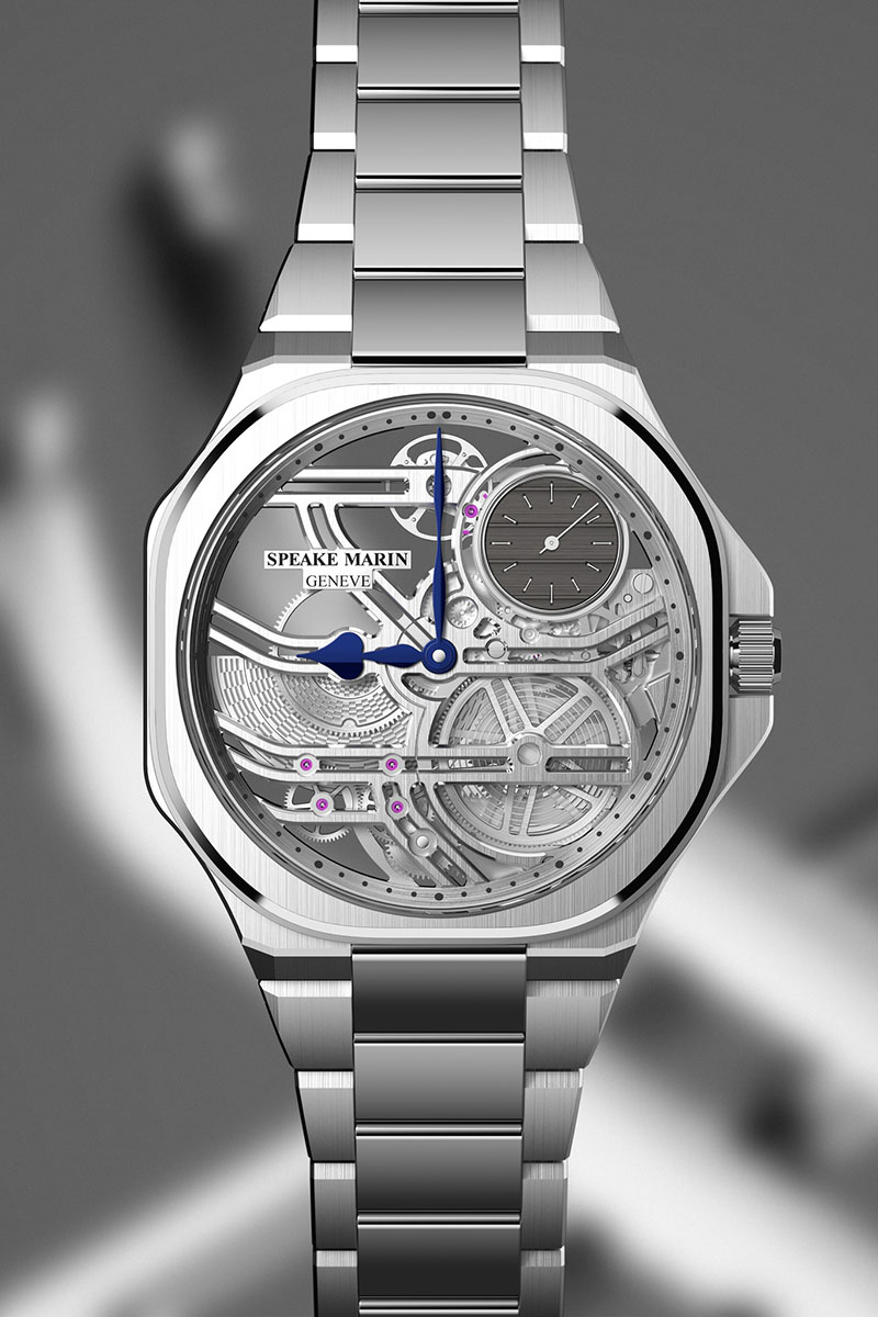Continuându-și călătoria către orizonturi neexplorate, Speake Marin introduce un ceas extrem de inovator: RIPPLES SKELETON, o nouă experiență tactilă și senzorială care intră în a patra dimensiune. Suntem cu toții în mișcare în spațiu si timp. Spațiul, care are trei dimensiuni fizice: lungime, lățime și adâncime și timp; timp pe care brandul îl interpretează într-un mod surprinzător. Inspirate de viitor, formele geometrice ale acestei creații high-end se intersectează armonios, lăsând spațiu generos luminii și reflexiilor sale, creând o puritate estetică esențială și o ușurință care o face aproape eterică în aspectul său distinctiv.