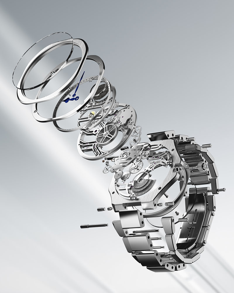 Placa principală, scheletizată, placată cu rodiu are un finisaj satinat vertical, profile teșite cu micromărgele și unghiuri lustruite. Combinația bine echilibrată de linii orizontale, care amintesc de modelul de ondulații, acum familiar, și curbele care îmbrățișează componente precum caseta arc și secundarul central de la 1:30, creează o arhitectură armonioasă.