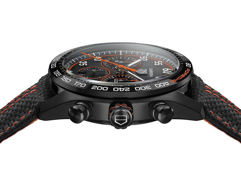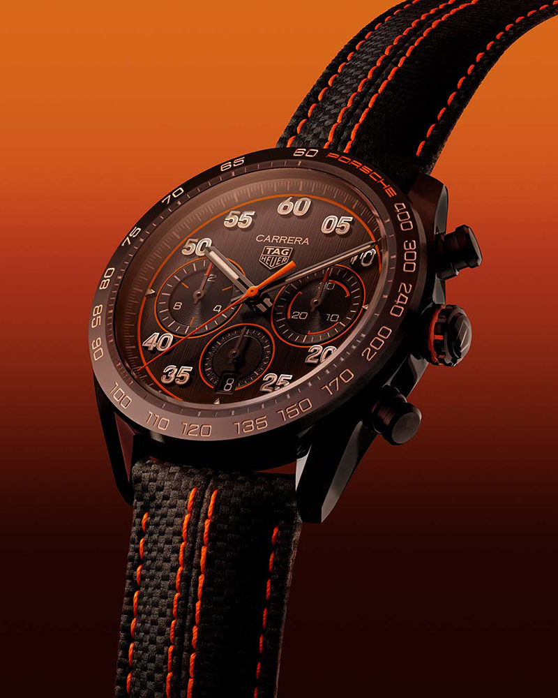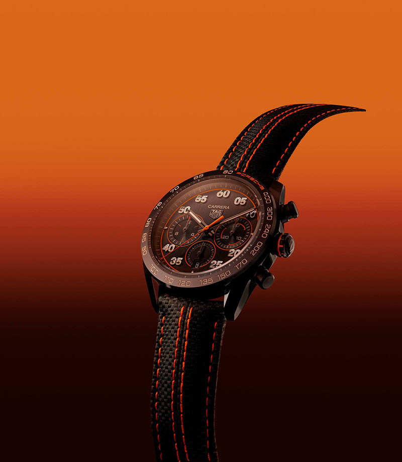 O altă culoare cheie în această ediție specială este negrul care întărește elegant, prin contrast, luminozitatea portocaliului. Pentru a crea acest finisaj armonios cu accente de culoare, designerii TAG Heuer au folosit negru în diverse texturi și finisaje. Carcasa a primit un tratament negru de cea mai înaltă calitate posibilă - DLC - diamond like carbon, cu culoarea sa extrem de profundă, elegantă și rezistența la zgârieturi. Finisajul cadranului negru este inspirat de viteză și energia cinetică. O altă moștenire de la TAG Heuer Carrera x Porsche din 2021 și 2022 este masa oscilantă personalizată, care aduce un omagiu volanului Porsche. Ea este vizibilă prin capacul carcasei din cristal de safir și este gravată în portocaliu cu "Porsche" și "TAG Heuer". Roata pe coloană are de această dată culoarea portocalie și împreuna cu notele negre ale mecanismului, leagă armonios elementele de design ale acestui nou ceas.