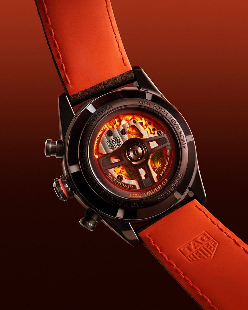 TAG Heuer Carrera Chronograph x Porsche Orange Racing susține calitatea și performanța oferite de calibrul Heuer 02, un mecanism fabricat în întregime la uzina TAG Heuer Chevenez compus din 168 de piese. Heuer 02 are un cronograf cu roată pe coloană și un ambreiaj vertical. Aceste caracteristici permit o performanță cronometrică excepțională și oferă o rezervă de mers impresionantă de 80 de ore.