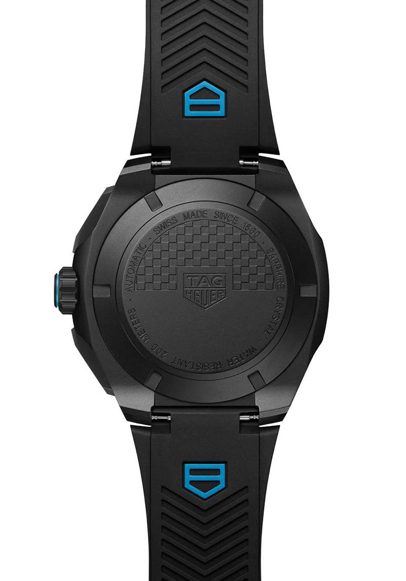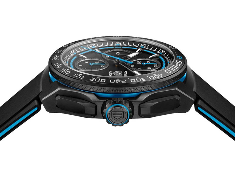 Luneta tahimetrică din aluminiu cu finisaj NAC negru, scala minutelor evidențiată în alb, arătătoarele scheletizate ale orelor și minutelor și butoanele cronografului integrate armonios în carcasă creează o estetică tehnică, coerentă. Detaliul coroanei cu accent albastru electric aduce o notă subtil jucăușă, inspirată de grafica și cromatica Formulei 1.