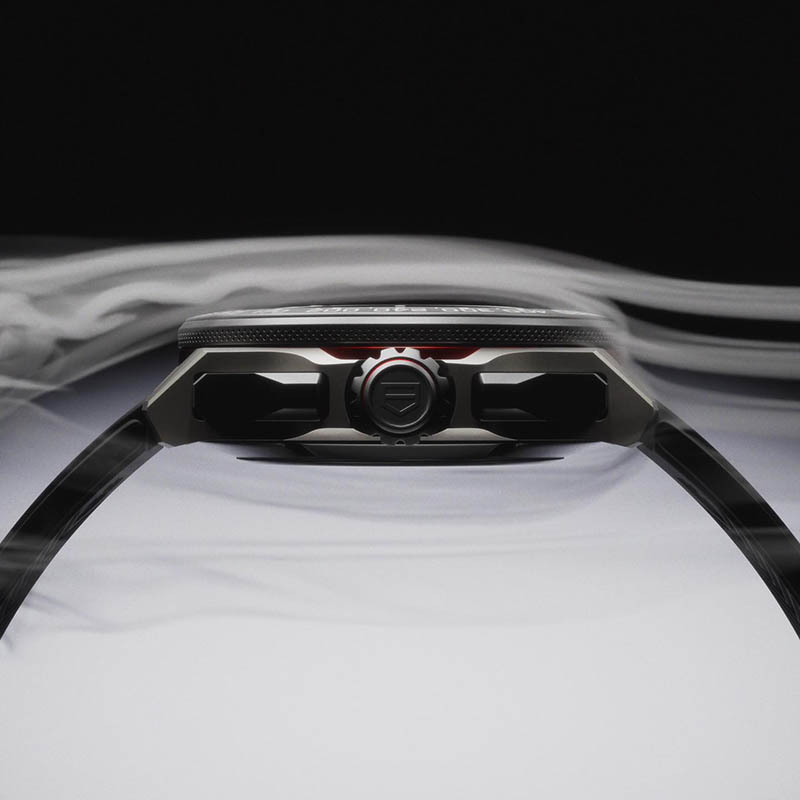 „Pista” minutelor, cu noii indecși inspirați din universul F1, înconjoară cadranul și amplifică senzația de mișcare, transformând ceasul într-o extensie a dinamismului de pe circuit.