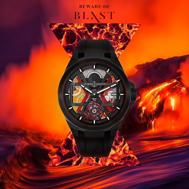 Încărcat cu savoir-faire-ul clasic Ulysse Nardin, BLAST este un avatar al timpului său, o forţă puternică a naturii. Această minune tehnologică, realizată cu linii masculine stâncoase, a aprins o flacără care va trimite undele de şoc seismice prin lumea orologeră, până la nucleul ei. Arhitectura complexă, geometrică a anselor mozaicate - care aminteşte de avioanele furtive - creează o capodoperă viguroasă şi impunătoare.