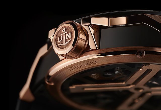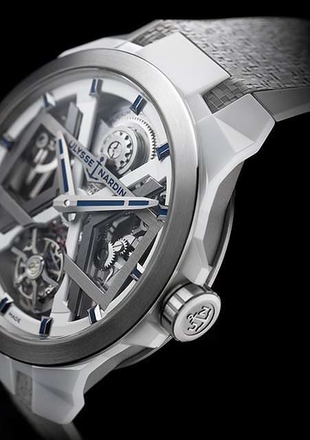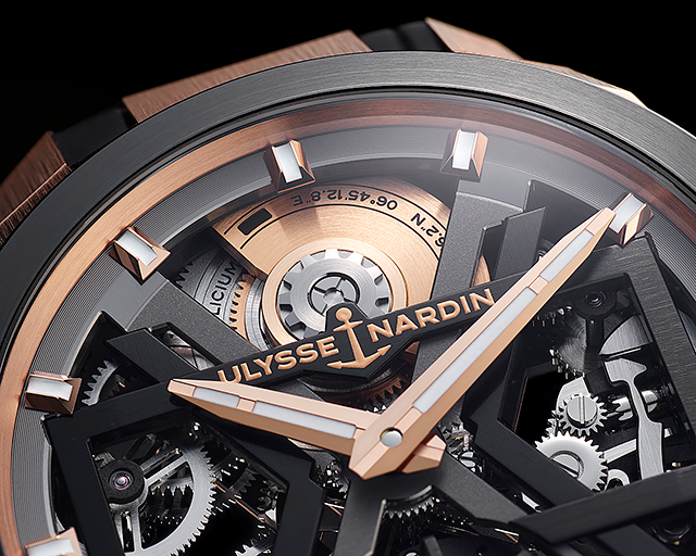 Designerii lui Ulysse Nardin au re-stilizat şi reconstruit ansele ceasului, făcându-le puternice şi geometrice, precum aripile ascuţite ale unui avion furtiv, în timp ce trece printr-o furtună.