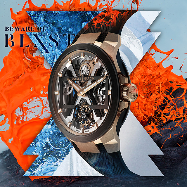 La fel ca şi în cazul lui FREAK X, SKELETON X şi DIVER X, BLAST îşi poartă „X”-ul în mod vizibil şi cu mândrie. Într-adevăr, „X” a devenit o temă de bază care progresează transversal în toate colecţiile Ulysse Nardin şi şi-a afirmat prezenţa în toate cele patru modele BLAST. Geometria sa de formă-în-formă-în-formă este o încântare vizuală: un „X”, încadrat într-un dreptunghi, ambele în interiorul unui cerc.