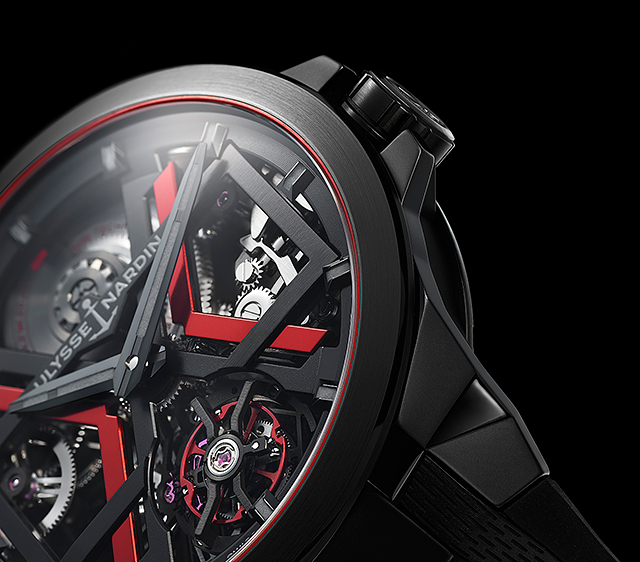 The iconic model of this line, BLACK BLAST comes complete with a ceramic upper middle case and bezel; black rectangular bridge, red and black double “X” pattern and a stunning new red balance wheel – the first time that Ulysse Nardin has ever developed a colored balance wheel. The crystal joint is red, so are the jewels and the lacquered inscription “Silicium Technology” on the barrel. Grey Ulysse Nardin logo completes the rectangular frame. The geometric horns are fully polished and sandblasted for a matte-finish.