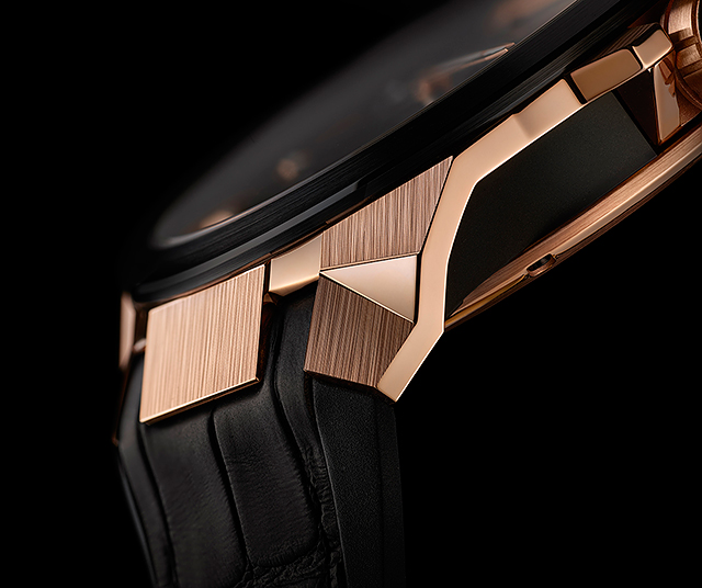 Forged from one of the most precious metals on Earth, this model features a black DLC middle case and solid gold horns, black ceramic bezel, a bicolor tourbillon cage rose gold colored and black PVD, sculpted rose gold indexes and hands set with Superluminova. Transparent jewels. Black X. Black Rectangle.