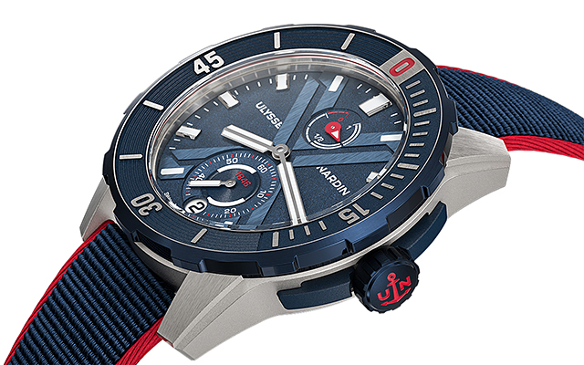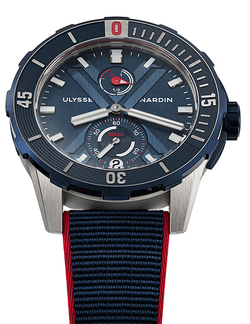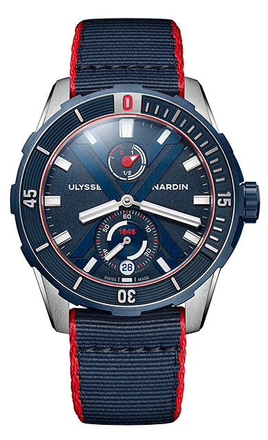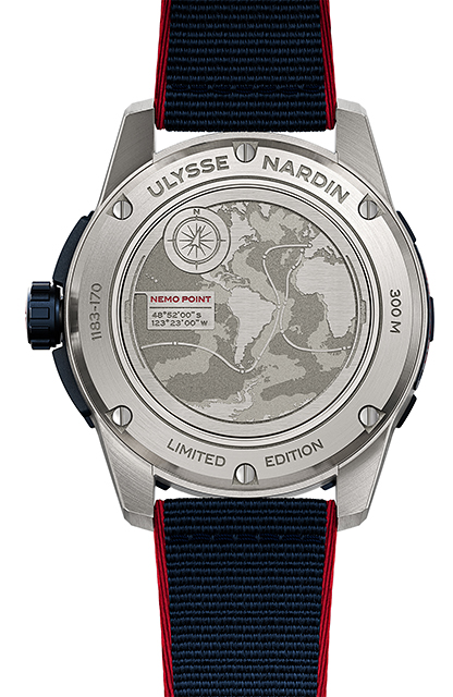 Cureaua din țesătură albastră, cu căptușeală roșie, amintește de cureaua unei plăci de surf. Velcro-ul de închidere este realizat în tehnologie de ultimă oră. Cu luneta albastră din cauciuc și X-ul recunoscut instantaneu pe față, Ulysse Nardin DIVER X NEMO POINT vor fi lansate doar într-o ediție limitată de 300 de piese. Mecanismul UN-118 garantează precizia în orice emisferă, în orice moment al zilei sau al nopții. X-ul albastru este imprimat cu îndrăzneală în relief pe față, iar traseul Vendée Globe este gravat pe spate.