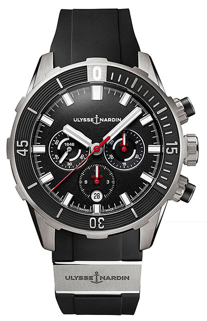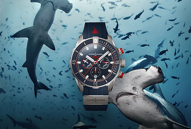 Numit pentru structura neobișnuită și distinctivă a capetelor lor, rechinii Hammerhead sunt prădători desăvârșiți care își folosesc capetele lor ciudate în formă de "ciocan" pentru a-și îmbunătăți capacitatea de a găsi prada. Acest slam-dunk în ediție limitată - doar 300 de piese - are un rechin cap de ciocan gravat pe spatele carcasei sale, un salut inteligent către frații săi mari, Diver Great White 44mm și Diver Blue Shark 42mm. Un model special de grilaj gravat, ce apare în spatele gurii larg deschise a rechinului, întărește agresivitatea animalului pentru a se obține un efect mai elegant și mai masculin. În plus, rechinul este acum prezentat frontal și nu în profil, pentru a-i da un aspect îndrăzneț și mai asertiv. Îmbrățișând tradiția "cap de ciocan" a lui Ulysse Nardin, marca dezvoltă de câțiva ani iconicele sale "ediții de cap de ciocan albastru și roșu". Acest nou cronograf este alimentat de mecanismul automat de manufactură UN-150, cu un eșapament de siliciu și cu 48 de ore de rezerva de mers. Atingeri de roșu sunt peste tot: de la articulația lunetei, arătătoarea de secunde a cronografului, butoanele de pornire / oprire / resetare și până, în final, cureaua de cauciuc cu un rechin ciocan roșu sculptat în cauciuc la ora 12. Placa laterală unică este de asemenea gravată cu numere roșii.