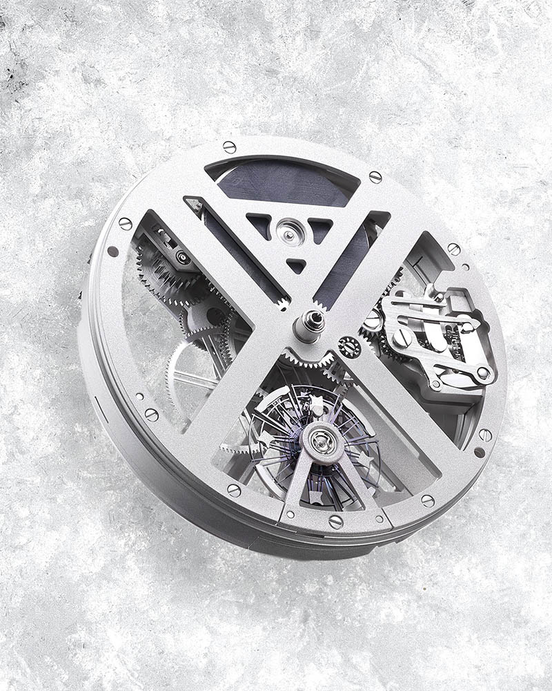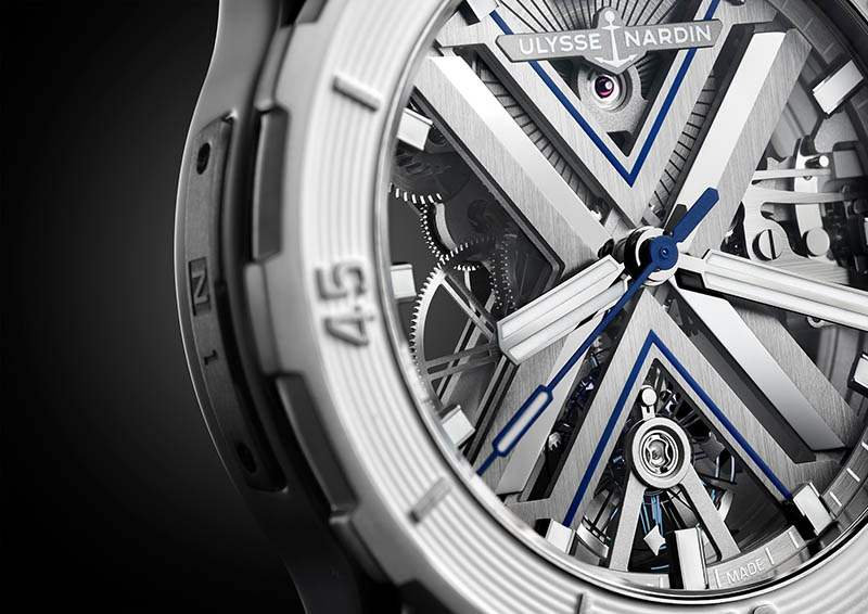 În inima carcasei din titan de 44 mm bate calibrul manufacturat UN-372, care afișează orele, minutele și secundele. Mecanismul automatic skeletonizat integrează un balansier supradimensionat din siliciu, iar roata de eșapament, ancora și arcul balansierului sunt, de asemenea, realizate din siliciu, material pe care Ulysse Nardin l-a introdus în orologerie încă din 2001.