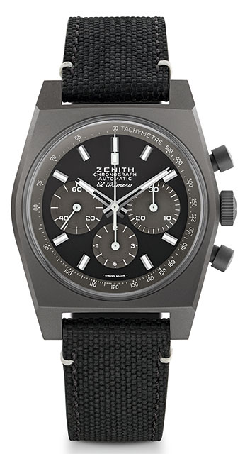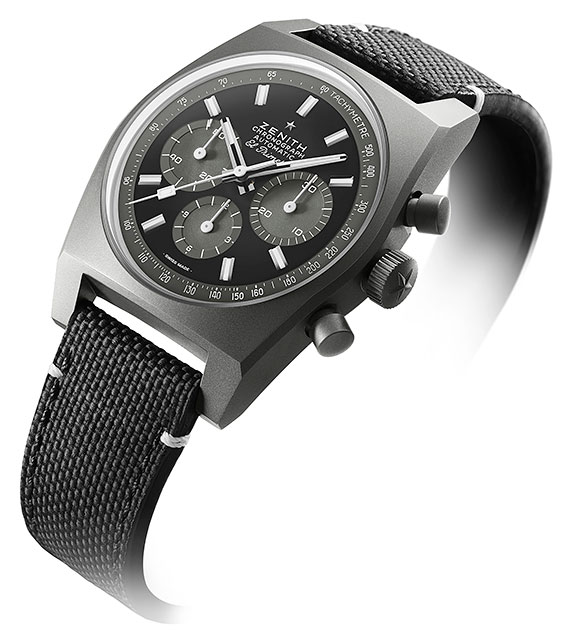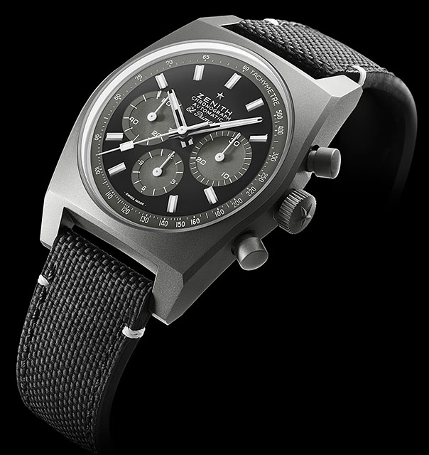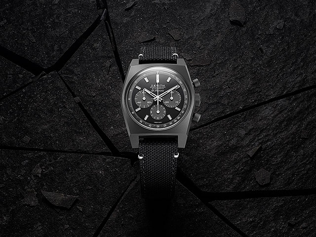 Dar, în loc de alegerea tradițională a oțelului inoxidabil cu un strat superficial de acoperire neagră, Zenith a optat pentru titanul microblast, punând în evidență nuanțele gri închis ale metalului ușor, dar foarte rezistent, cu finisaj complet mat.