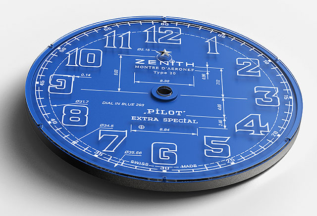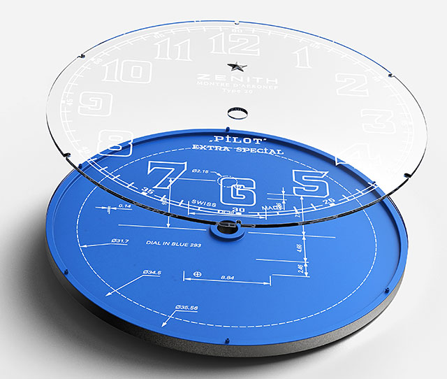 Când ne uităm la cadranul unui ceas, avem tendința de a acorda atenție culorilor, finisajului, formei arătătoarelor și marcajelor, tipografiei cifrelor, fără a ne gândi prea mult la calculele precise și la considerațiile de proiectare care intră în realizarea acestuia. Și totuși fiecare cadran Zenith este gândit și dezvoltat meticulos, unde niciun detaliu nu este lăsat la voia întâmplării. Designerii de la Manufacture au căutat să evidențieze acest aspect "nevăzut" al cadranului, prin încorporarea planurilor sale de producție direct în ele. Neașteptat și captivant, cadranul este creat în două părți: o bază albastră mată cu toate planurile tehnice și notele utilizate pentru cadran și, deasupra, un cristal de safir și un strat de cristal de safir cu marcajele obișnuite și sigla. Acest lucru creează un efect vizual captivant de profund, în care diferitele marcaje aruncă o ușoară umbră pe baza albastră și dau impresia că plutesc deasupra cadranului.