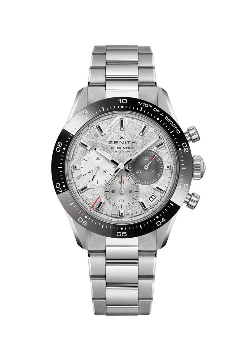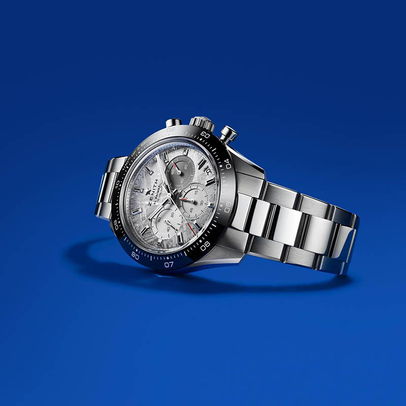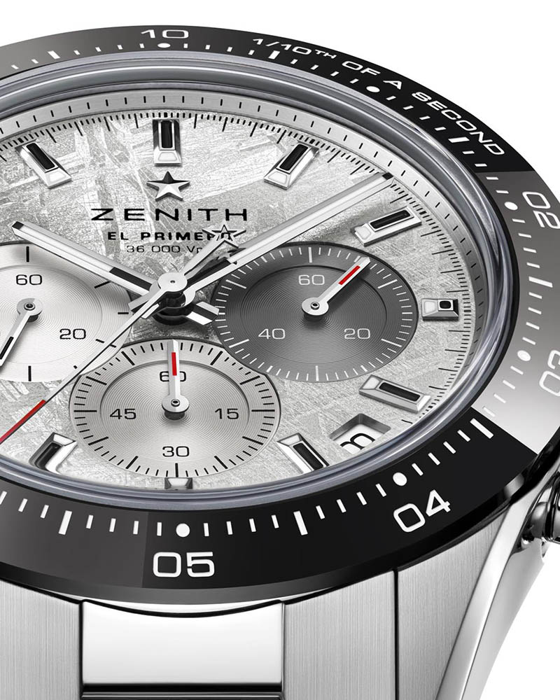 Noul Zenith Chronomaster Sport Meteorite are un cadran gri din meteorit, finisat manual pentru a păstra liniile caracteristice modelului Widmanstätten. Pe această pânză cosmică, contoarele tricolore emblematice ale mecanismului El Primero, în argintiu, gri deschis și antracit oferă un contrast armonios, fiecare fiind decorat cu un finisaj circular azur. Arătătoarele de ore și minute tip baghetă, tratate cu Super-LumiNova, asigură lizibilitate excelentă în orice lumină, iar afișajul este completat de o fereastră discretă pentru dată situată la ora 4:30.